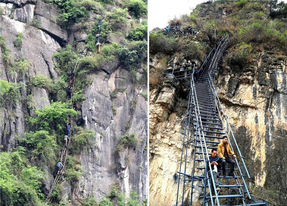 拼版照片:左圖為通往四川涼山彝族自治州昭覺縣阿土列爾村的簡易藤梯(2016年5月14日攝);右圖為改建后的鋼梯(2017年12月5日攝)。新華社發(阿克鳩射 攝)