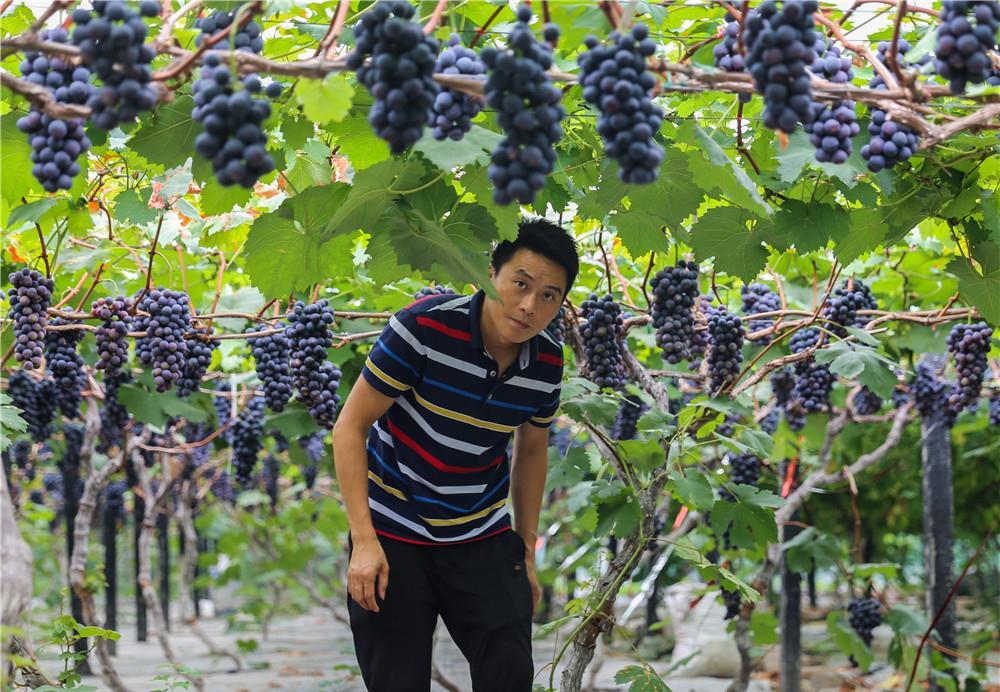 在四川省眉山市彭山區果園村,張雄在查看葡萄長勢(6月16日攝)。新華社記者 王曦 攝