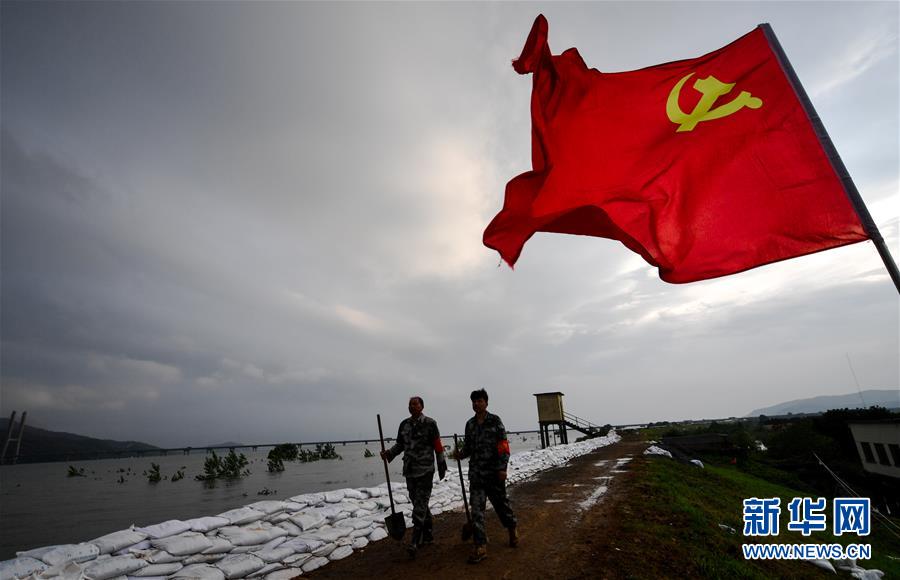 7月19日,陳申桃(右)在圩堤上值守。新華社記者 胡晨歡 攝