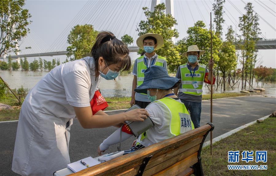 7月24日,在武漢青山江灘羅家港防汛值守哨棚旁,武昌區楊園街社區衛生服務中心醫務人員為巡堤員測量血壓和心率。從7月6日開始,該中心醫務人員攜帶醫藥箱和消毒器具每天兩次往返于3.7公里的長江岸堤,為巡堤員測量血壓、監測體溫,并宣傳防疫知識。新華社記者 肖藝九 攝