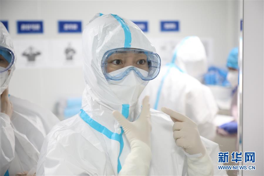 海軍軍醫大學第二附屬醫院急診、重癥醫學科護士長陳靜在武漢火神山醫院進入“紅區”前檢查防護服(3月25日攝)。新華社發(陳晨 攝)