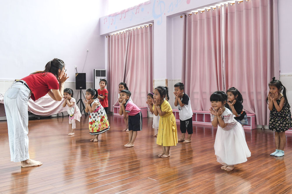 ↑廣西興業縣幼兒園老師與小朋友一起排練節目?