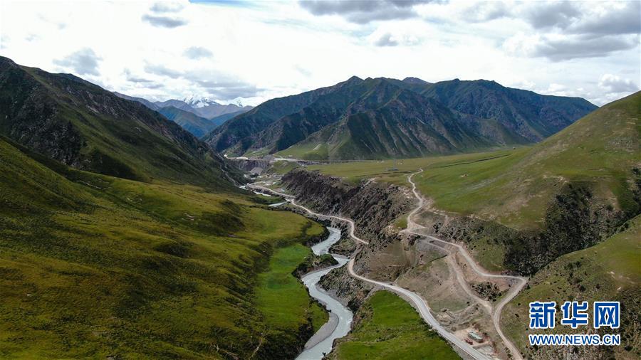 青海省果洛藏族自治州瑪沁縣雪山鄉陰柯河村周邊草場,遠處可看到阿尼瑪卿雪山一角(8月20日攝,無人機照片)。? 新華社記者 張龍 攝