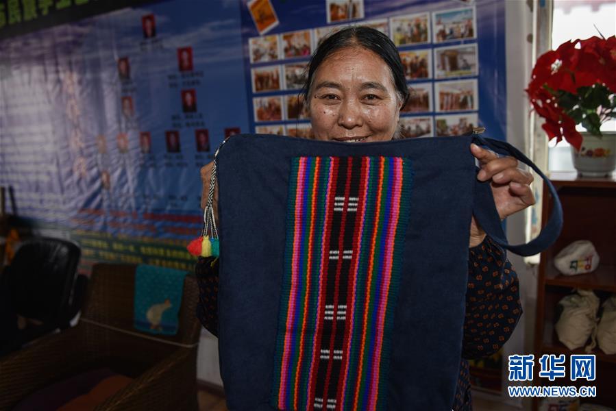 格爾木市長江源村崗巴布民族手工藝品專業合作社的社員展示制作的工藝品。攝于2020年5月。新華社記者 吳剛 攝