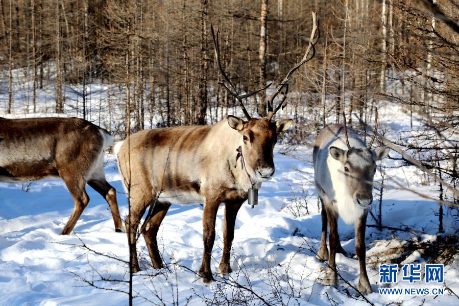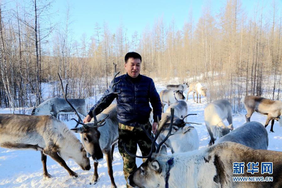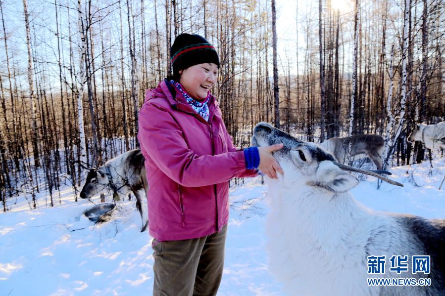 在黑龍江省大興安嶺地區呼中區飛虎山5號線,冬日暖陽穿過莽莽林海,投下斑駁光影。伴著清脆的鹿鈴聲,馴鹿群覓食歸來。曹樹權邊拍著一頭馴鹿,邊給它喂食豆餅,興奮的“小家伙”一直親昵地往他身上蹭。