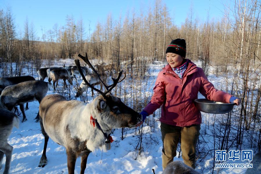 在黑龍江省大興安嶺地區飛虎山5號線,曹樹權的妻子姜雪梅正在給馴鹿喂食(2020年11月22日攝)。新華社發