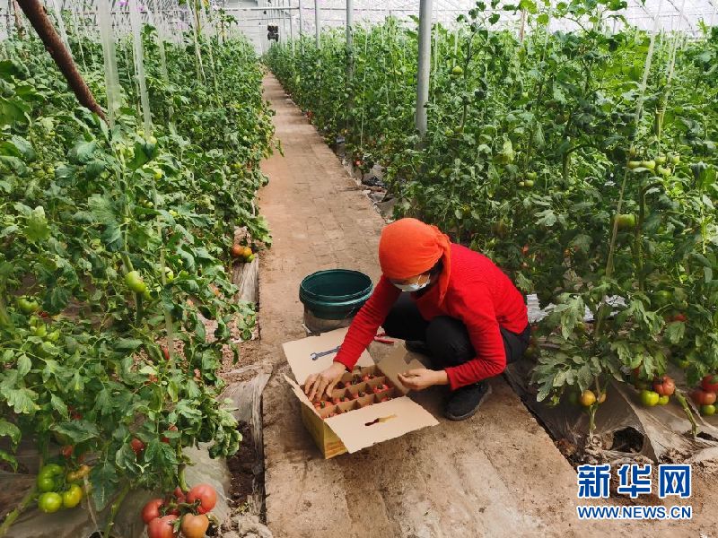 村民薄素梅正在將西紅柿采摘裝箱。新華社記者 王勁玉 攝