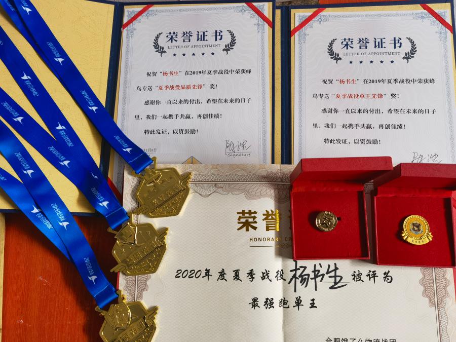 楊書生在展示他的“跑單王”榮譽勛章。 新華社記者 馬姝瑞 攝