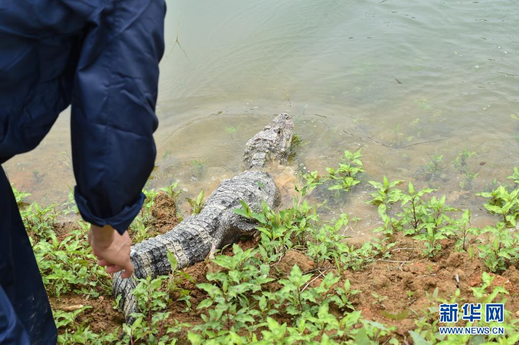 5月13日,工作人員放歸揚子鱷。當日,安徽揚子鱷國家級自然保護區在涇縣雙坑片區揚子鱷核心棲息地放歸51條人工繁育揚子鱷?!⌒氯A社記者 韓旭 攝