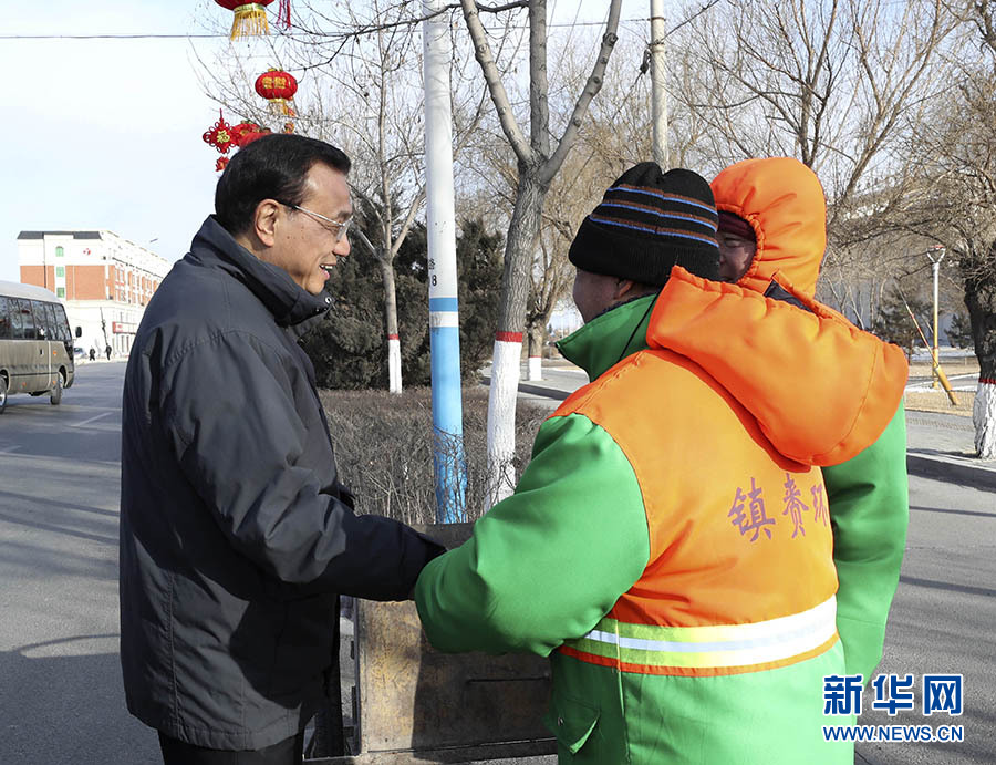 2月12日至13日,中共中央政治局常委、國務院總理李克強在吉林省白城市鎮賚縣考察。 這是2月12日,李克強在鎮賚縣同環衛工人握手交流。新華社記者 龐興雷 攝