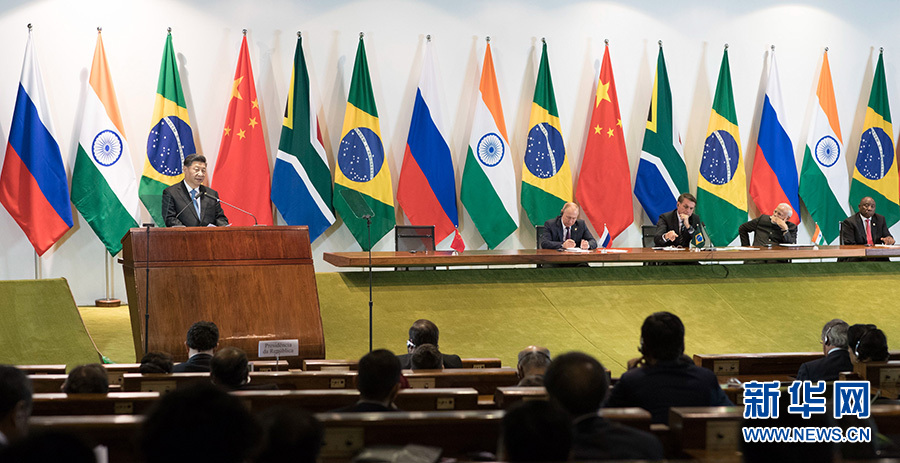 當地時間11月14日,金磚國家領導人同金磚國家工商理事會和新開發銀行對話會在巴西利亞舉行。中國國家主席習近平、巴西總統博索納羅、俄羅斯總統普京、印度總理莫迪、南非總統拉馬福薩共同出席。這是習近平發表講話。 新華社記者 王曄 攝
