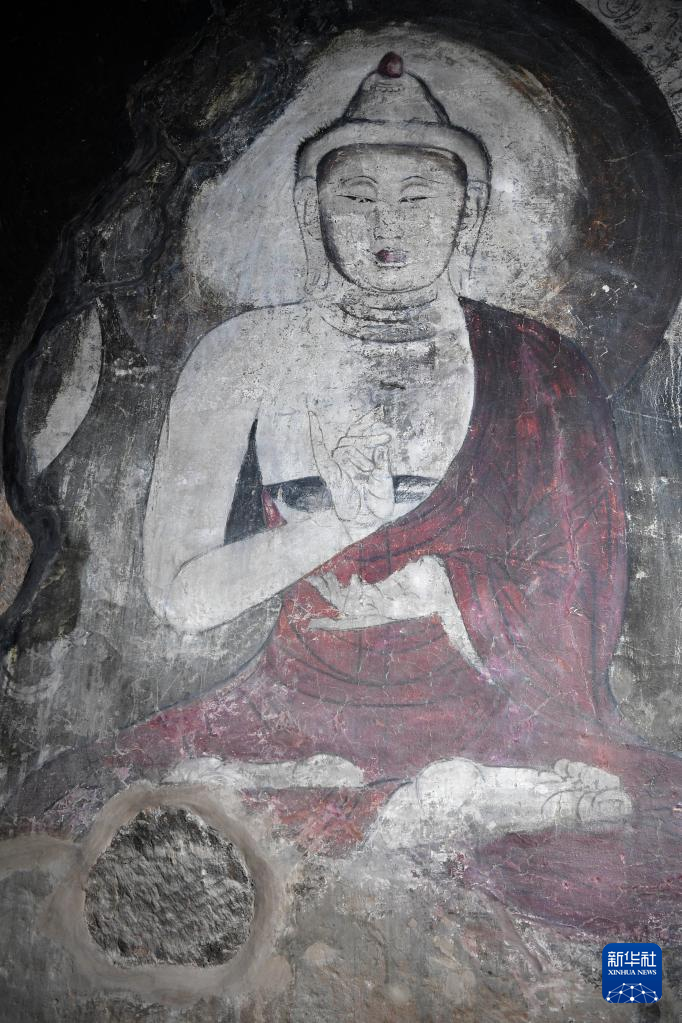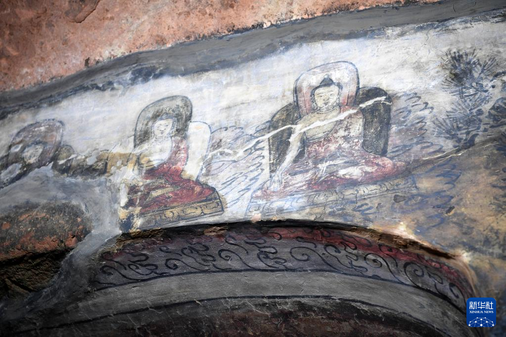 這是寧夏須彌山石窟圓光寺48號窟內完成修復的壁畫(2月28日攝)。
