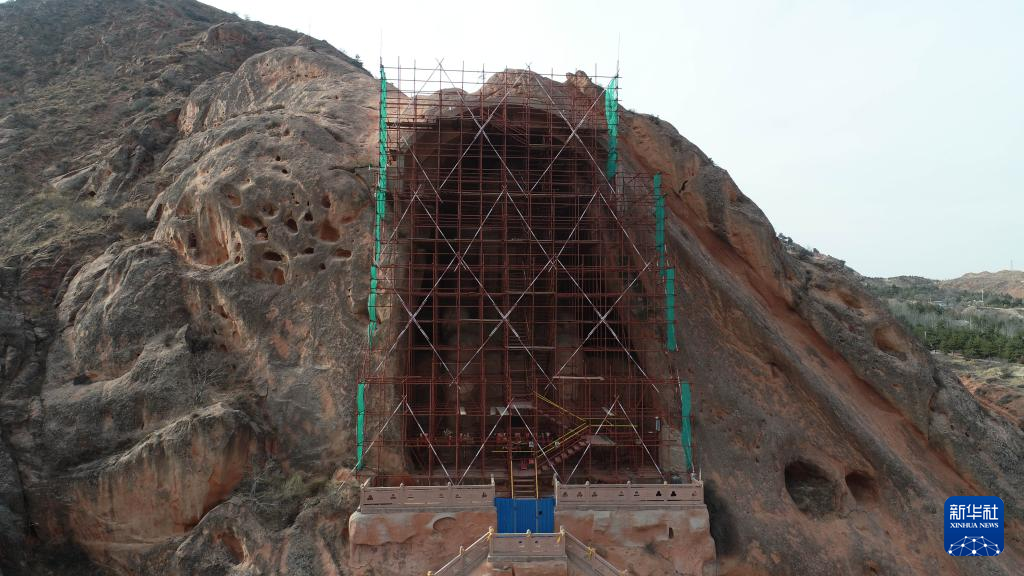 這是寧夏須彌山石窟正在修復中的大佛(2月28日攝,無人機照片)。