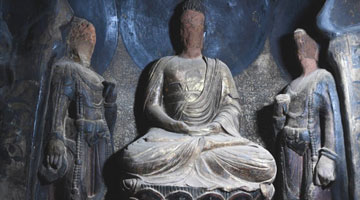 這是寧夏須彌山石窟圓光寺48號窟內完成修復的佛像(2月28日攝)。