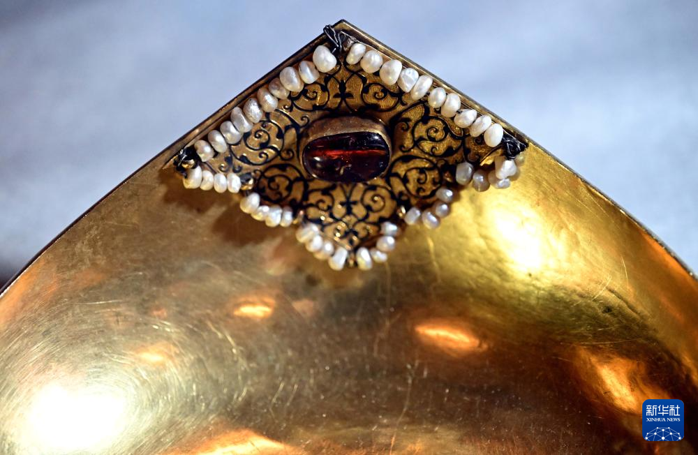 這是即將展出的船形杯局部(11月13日攝)。船形杯是古代俄羅斯最具特色的容器之一。在宴會上,船形杯被用來盛放最受歡迎的俄羅斯飲料——蜂蜜或蜂蜜酒。