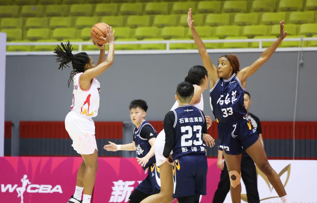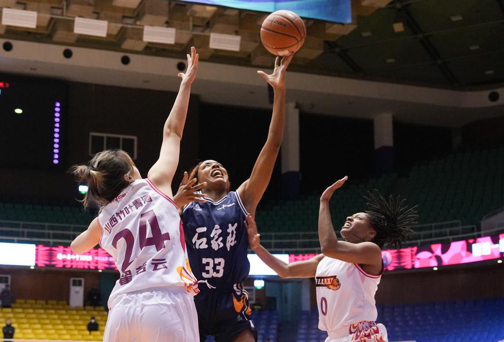 1月10日,在2024-2025賽季中國女子籃球聯賽(WCBA)常規賽中,山西女籃球員翟若云正在防守石家莊隊球員克里斯汀·奇奧馬·安妮格威(中)。新華社發(梁子棟攝)