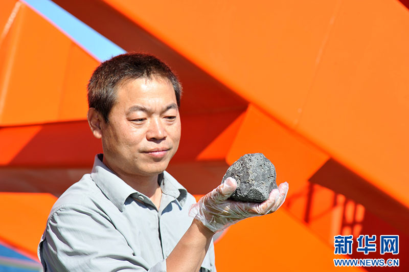 桂林理工大學隕石與物質研究中心主任繆秉魁展示我國南極隕石中最大的無球粒隕石——灶神星隕石GRV 13001。 新華社記者 張建松攝