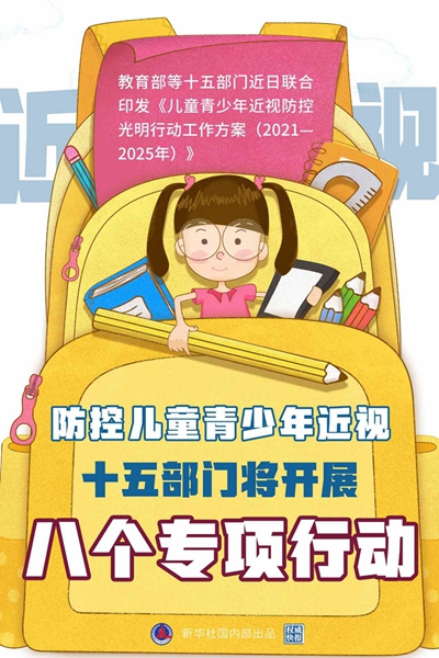 ????? 教育部等十五部門近日聯合印發《兒童青少年近視防控光明行動工作方案(2021—2025年)》,共同實施八個專項行動防控兒童青少年近視。工作方案提出,力爭到2025年每年持續降低兒童青少年近視率,有效提升兒童青少年視力健康水平。