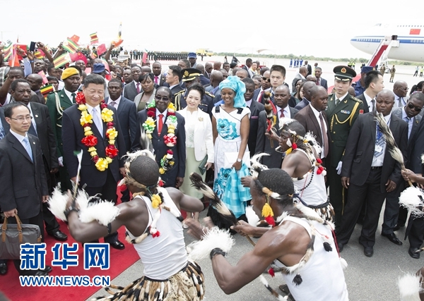 穆加貝在機場舉行隆重歡迎儀式。軍樂隊奏中國國歌,鳴21響禮炮。在穆加貝陪同下,習近平登上檢閱臺。習近平檢閱儀仗隊,軍樂隊奏津巴布韋國歌。津巴布韋兒童向習近平和穆加貝獻上花環,向彭麗媛和穆加貝夫人獻上鮮花。前來參加歡迎儀式的津巴布韋政府內閣部長、外國駐津使節等在紅地毯旁列隊,當地民眾跳起歡快熱情的傳統舞蹈,歡迎習近平和彭麗媛到訪。在機場通往下榻酒店的街道沿途,數萬津巴布韋民眾載歌載舞,夾道歡迎習近平和中國代表團。