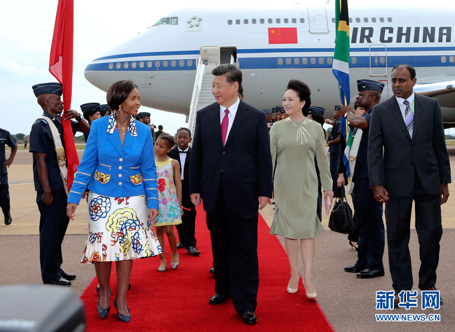 當地時間下午1時45分許,習近平乘坐的專機抵達比勒陀利亞瓦特克盧夫空軍基地。習近平和夫人彭麗媛受到南非外長馬沙巴內等政府高級官員熱情迎接。南非兒童向習近平夫婦獻上鮮花。禮兵在紅地毯兩側行注目禮。