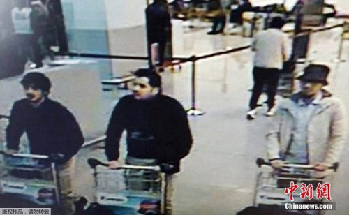 比利時聯邦警察公布一張機場監控拍攝下的三名機場恐襲嫌疑犯的視頻截圖。
