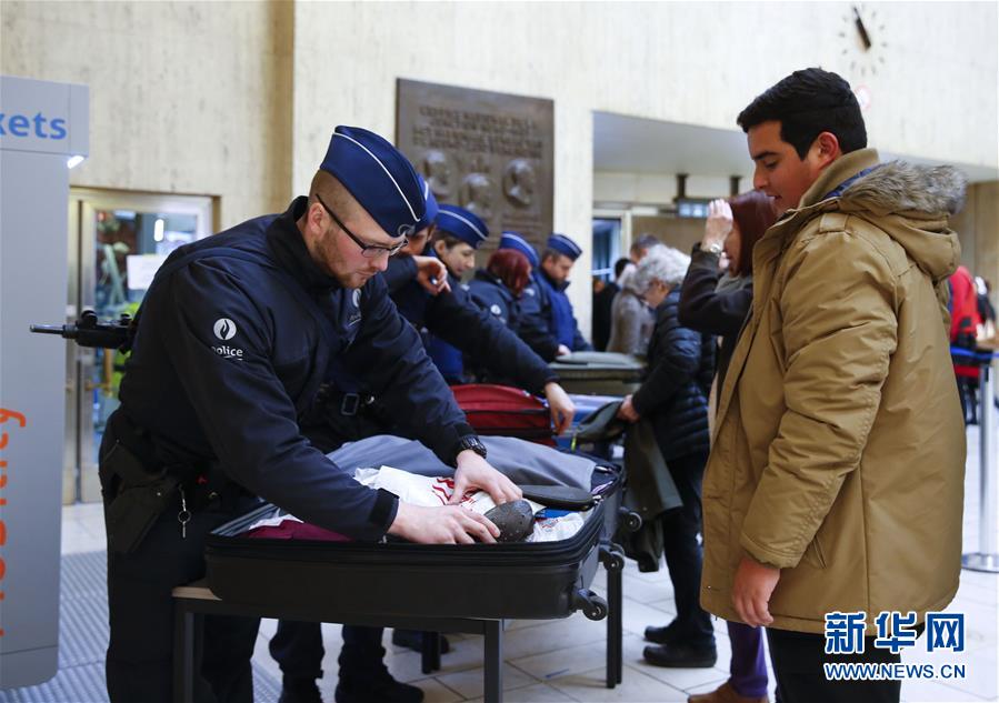 3月23日,在比利時首都布魯塞爾市中央火車站內,乘客接受警察安檢。 22日,布魯塞爾市郊扎芬特姆機場和市內歐盟總部附近地鐵站接連發生恐怖襲擊事件,造成至少34人死亡、180多人受傷。 新華社記者葉平凡攝