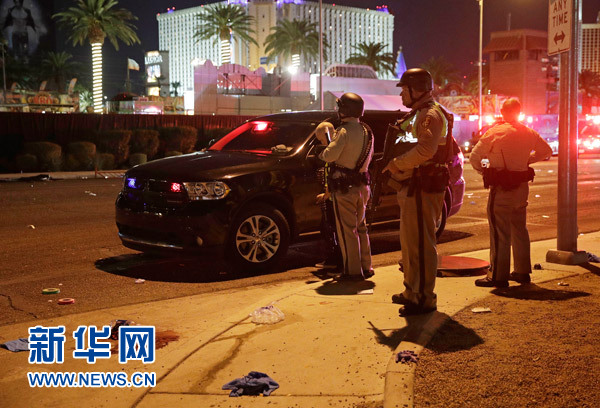 10月2日,在美國西部城市拉斯維加斯,警察在槍擊事件現場警戒。新華社/美聯