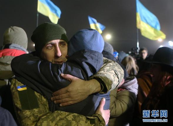 12月28日,親屬們在烏克蘭基輔迎接換回的戰俘。新華社發(謝爾蓋 攝)