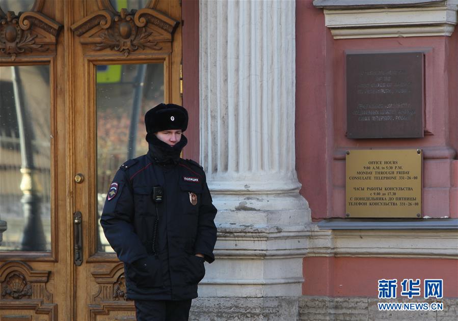 3月30日,一名警察在美國駐俄羅斯圣彼得堡總領館前執勤。新華社記者魯金博攝