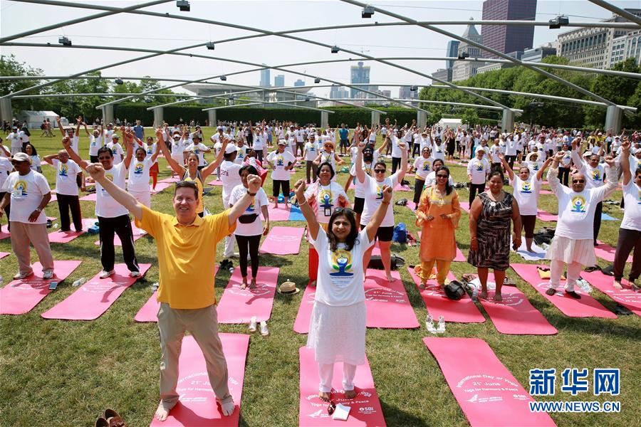 6月16日,在美國芝加哥千禧公園,人們參加集體瑜伽活動慶祝即將到來的國際瑜伽日。聯合國2014年通過決議,將每年的6月21日定為國際瑜伽日。 新華社記者汪平 攝