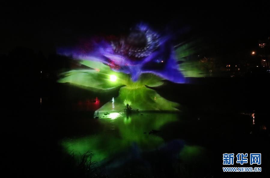 這是11月15日在德國柏林植物園拍攝的水霧燈飾。 新華社記者單宇琦攝