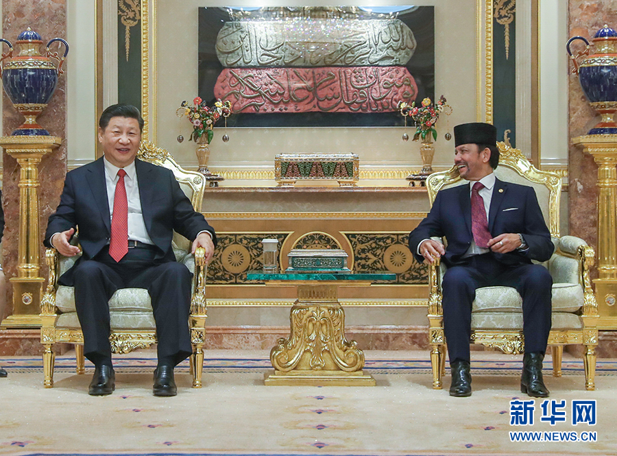 習近平同文萊王室成員親切交談。習近平表示,衷心祝賀文萊經濟社會發展取得的成就。一踏上這片和平美麗的土地,我就真切感受到蘇丹陛下和王室以及文萊人民對中國人民的深情厚誼。中方贊賞文萊王室長期奉行對華友好政策,歡迎王室成員多到中國各地走走、看看。相信在雙方共同努力下,中文傳統友好將不斷發揚光大,兩國互利合作將不斷取得豐碩成果。