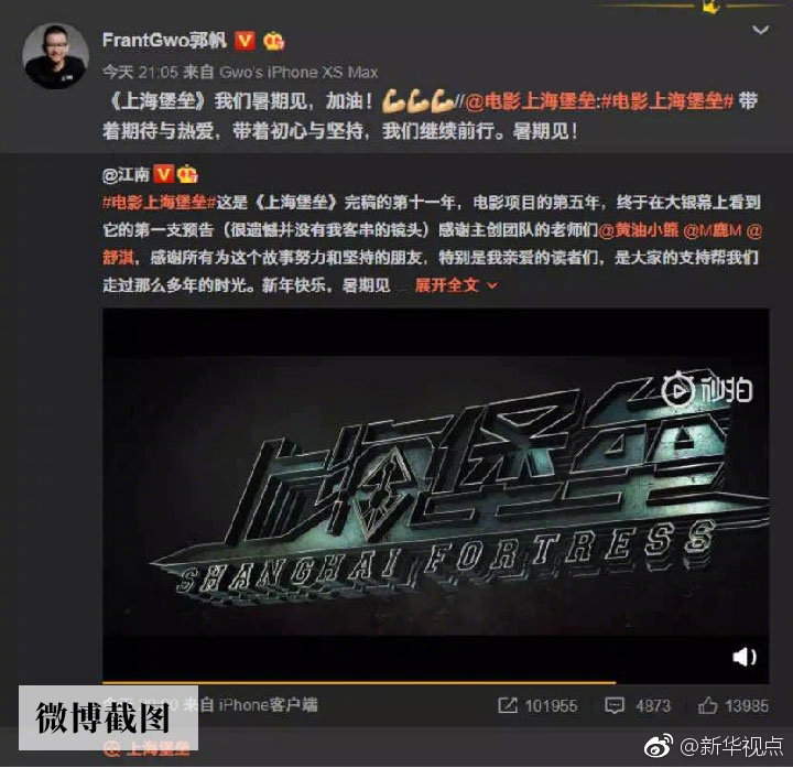 郭帆日前就在微博上轉發了科幻電影《上海堡壘》首個宣傳片,并表達對影片的期待。此片也是由《流浪地球》聯合出品方之一的騰訊影業參與出品,預計將于今年暑期上映。這種“抱團取暖”的作法也讓不少科幻迷在網上津津樂道。