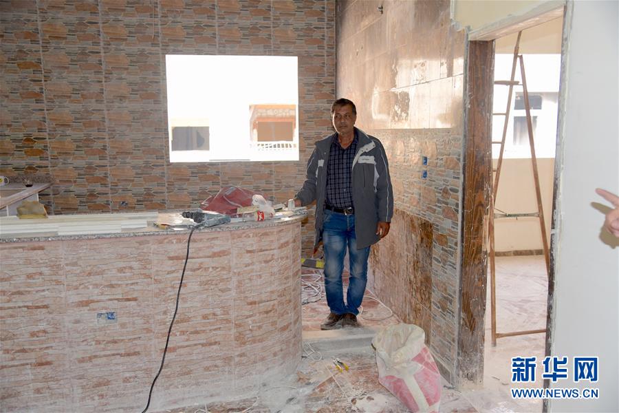 3月12日,在敘利亞大馬士革東古塔地區,當地居民薩米爾·加巴里站在自家新砌起的廚房臺面旁。 新華社發(胡馬姆·謝赫·阿里 攝)