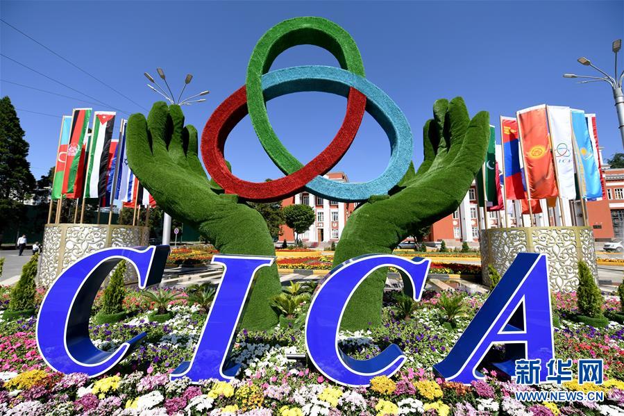 這是6月13日在塔吉克斯坦首都杜尚別拍攝的亞洲相互協作與信任措施會議標識。