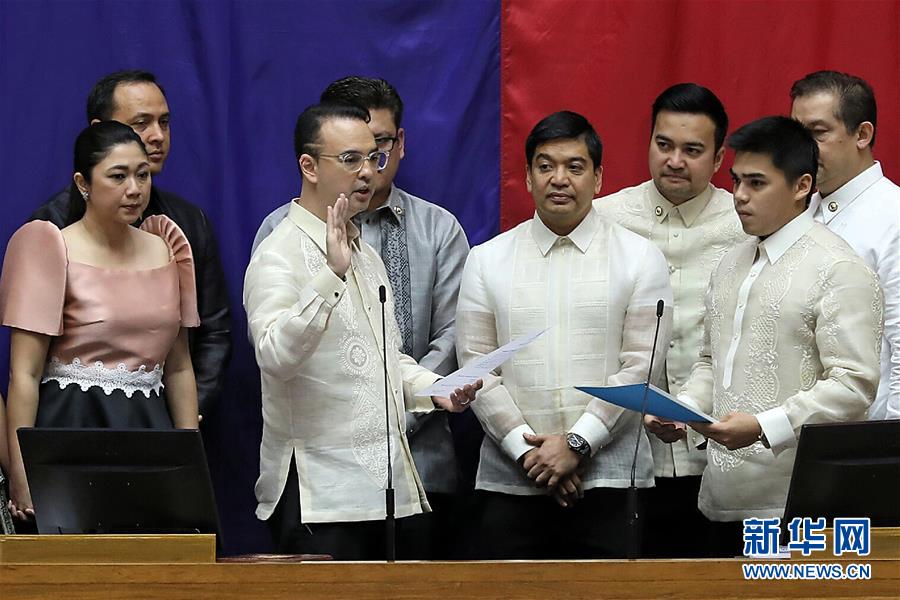 7月22日,在菲律賓大馬尼拉地區的奎松城,艾倫·彼得·卡耶塔諾(左三)宣誓就職新一任菲律賓眾議長。新華社發