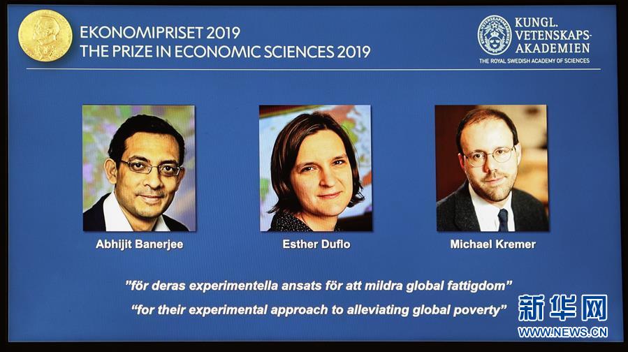 新華社斯德哥爾摩10月14日電(記者和苗)瑞典皇家科學院14日宣布,將2019年諾貝爾經濟學獎授予阿比吉特·班納吉、埃絲特·迪弗洛和邁克爾·克雷默三名經濟學家,以表彰他們在減輕全球貧困研究領域作出的突出貢獻。