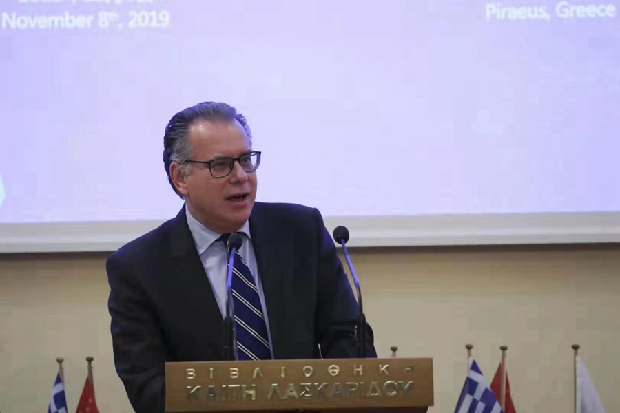 希臘外交部副部長米爾提阿迪斯·瓦維特斯奧提斯在研討會上致辭。中國日報記者 匡林華 攝