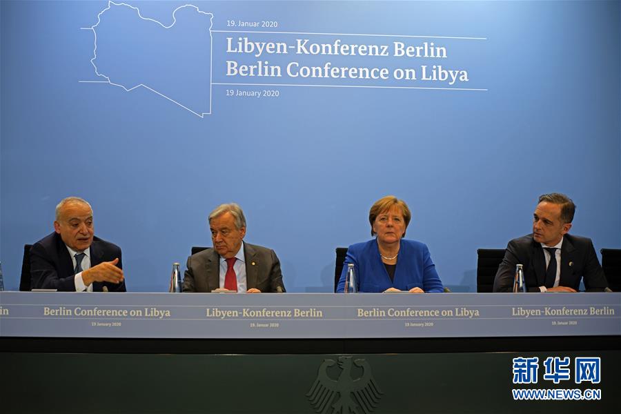 1月19日,在德國柏林,聯合國秘書長利比亞問題特別代表薩拉姆、聯合國秘書長古特雷斯、德國總理默克爾和德國外長馬斯(從左至右)在利比亞問題柏林峰會閉幕后召開新聞發布會。新華社記者 王勍 攝