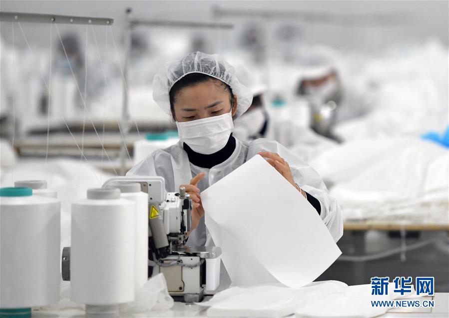 1月28日,在仙桃市湖北裕民防護用品有限公司生產車間內,工人在生產醫用防護用品。新華社記者 李賀 攝