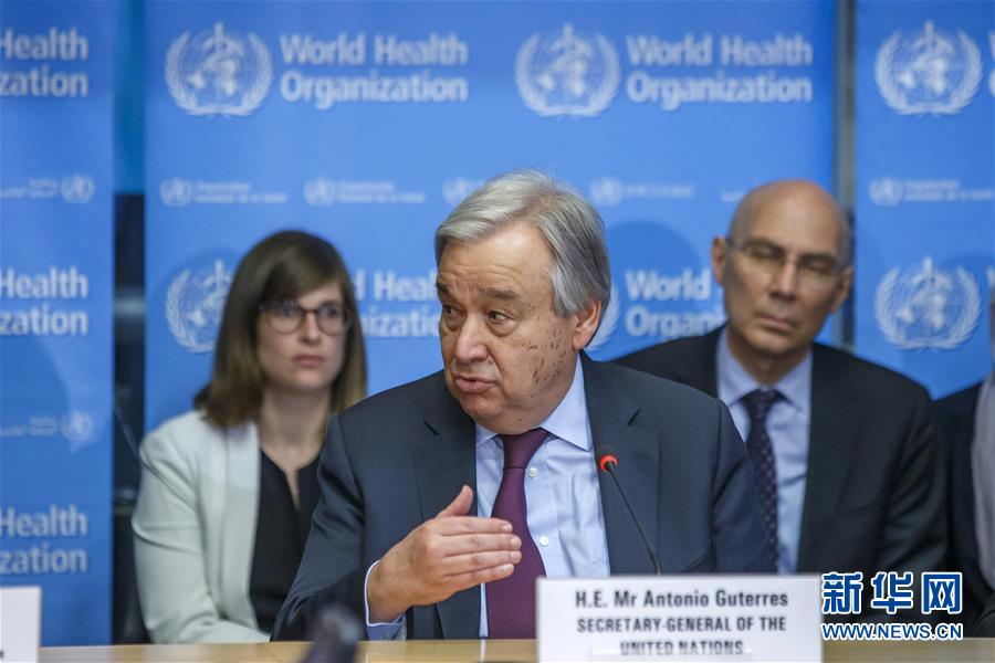 2月24日,在瑞士日內瓦,聯合國秘書長古特雷斯(前)在世界衛生組織總部發表講話。新華社發