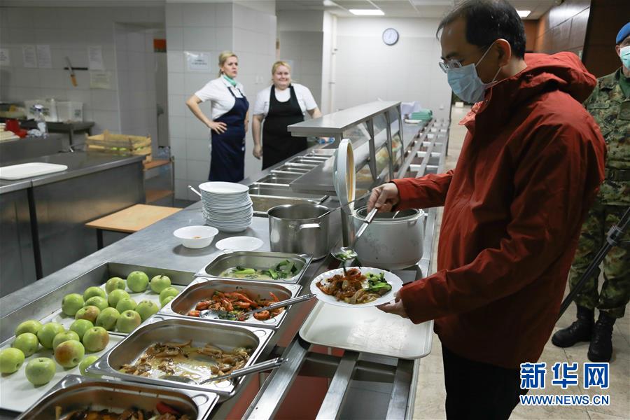 3月24日,在塞爾維亞首都貝爾格萊德,中國援助塞爾維亞抗疫醫療專家組成員、中山大學附屬第三醫院感染科副主任林炳亮在食堂準備就餐。新華社記者 石中玉 攝