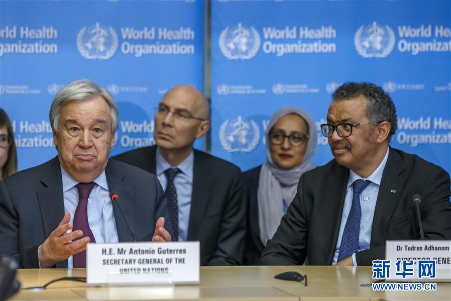 在全球抗擊新冠疫情斗爭中,世界衛生組織始終發揮著領導和統籌的關鍵作用。聯合國秘書長古特雷斯4月14日晚間通過發言人發表聲明說,世界衛生組織必須得到支持,這對全球戰勝新冠疫情的努力絕對關鍵。這是2月24日,在瑞士日內瓦,聯合國秘書長古特雷斯(左)在世界衛生組織總部發表講話。新華社發