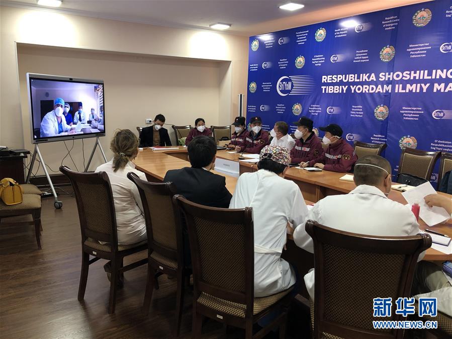 4月19日,在烏茲別克斯坦首都塔什干,中國赴烏聯合工作組成員與烏方醫護人員遠程會診患者。新華社發