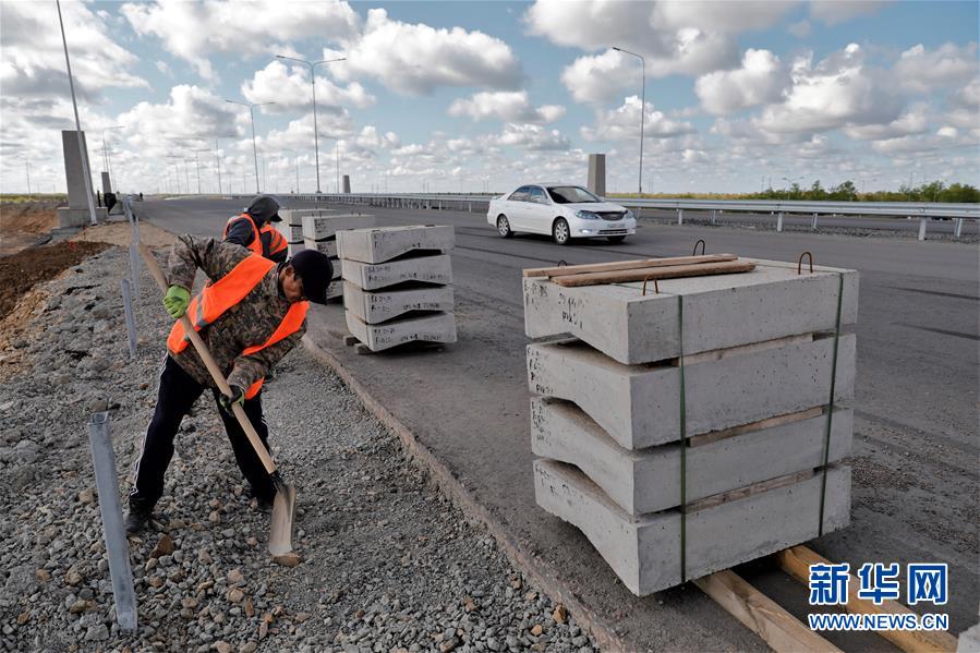 5月4日,工人在哈薩克斯坦首都努爾蘇丹環城公路項目上施工。 新華社發(奧斯潘諾夫攝)