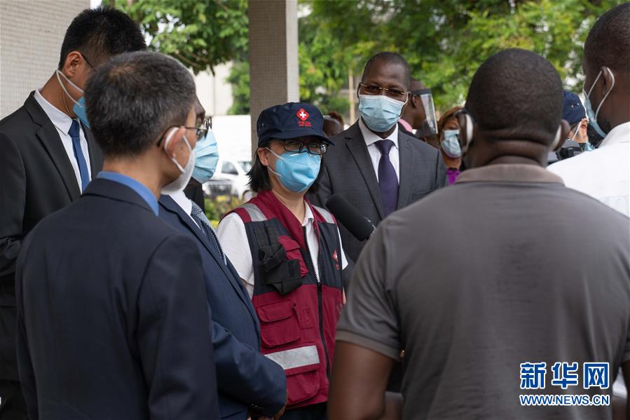 5月4日,在科特迪瓦經濟首都阿比讓,中國抗疫醫療專家組組長劉筠(中)接受采訪。 新華社記者 鄭揚子 攝