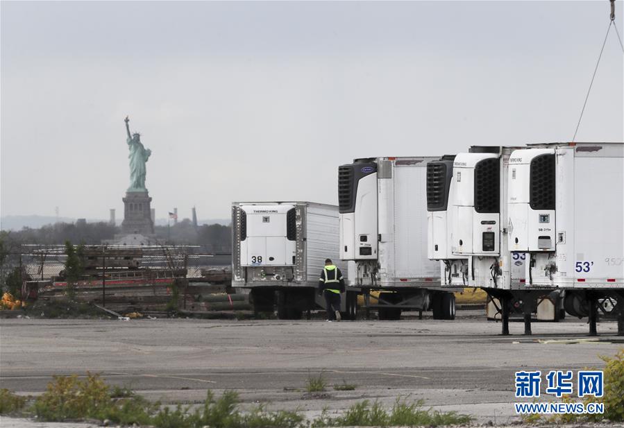 5月11日,冷藏車停放在美國紐約布魯克林一處新開辟的臨時停尸場所內。新華社記者 王迎 攝