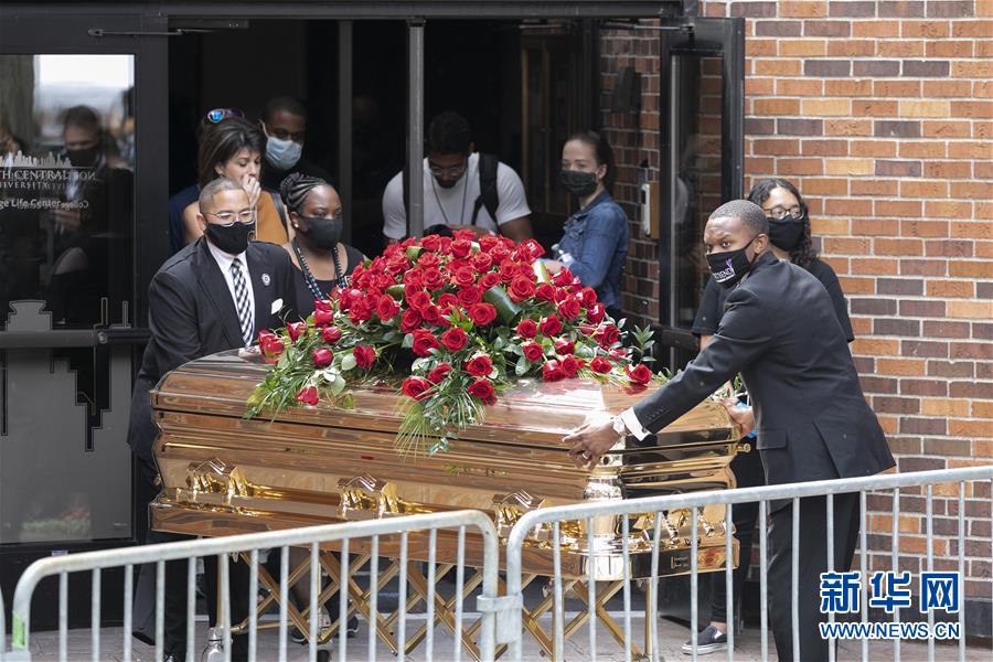 6月4日,在美國明尼蘇達州明尼阿波利斯市北部中央大學,人們抬出喬治·弗洛伊德的靈柩。 當日,喬治·弗洛伊德的追悼會在明尼阿波利斯市北部中央大學舉行。 新華社發(本·霍夫蘭攝)