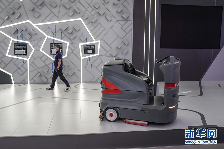9月1日,在北京奧林匹克公園中軸景觀大道室外展館服務機器人專區,自動掃地機器人在工作。 2020年中國國際服務貿易交易會將于9月4日-9日在北京國家會議中心召開。9月1日,記者來到國家會議中心以及周邊室外場館進行探訪。 新華社記者 彭子洋 攝