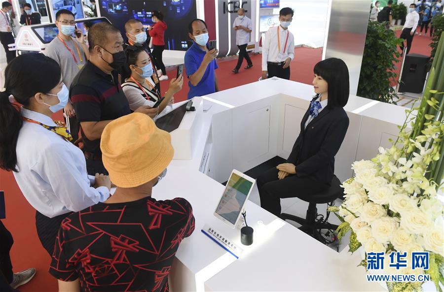 9月5日,在服貿會金融服務專題展區,參觀者在一家參展機構的展位與銀行仿真機器人大堂經理(右)交流互動。據介紹,該機器人名叫“小龍女”,依托人工智能技術,通過仿生控制系統智能化匹配交流場景,可在銀行大廳為顧客提供業務咨詢、引導分流等服務。新華社記者 魯鵬 攝